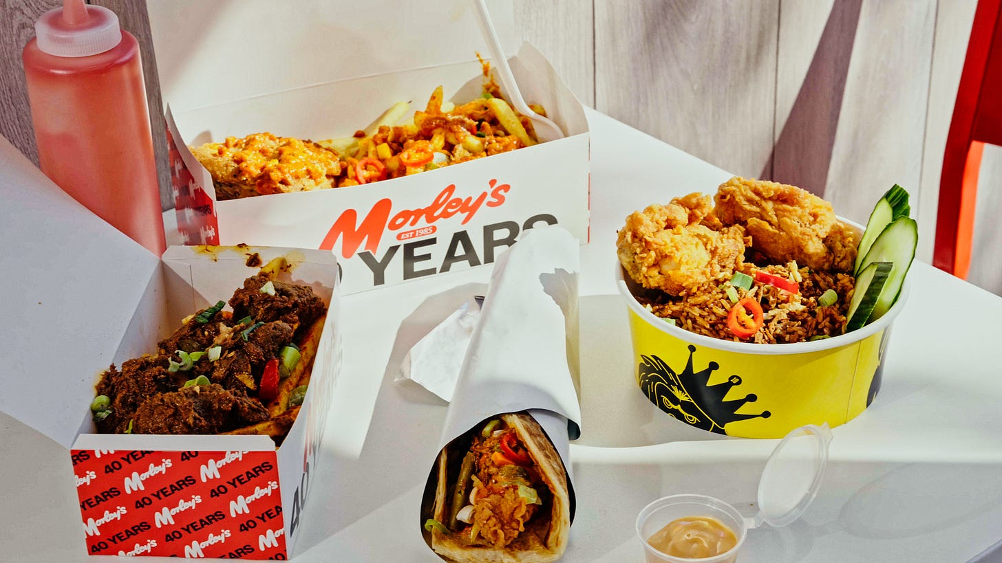 The menu: nasi goreng with three Morley’s wings and a fried egg. A two-piece with fries dusted in Roti King spice. Chicken tenders stuffed into roti canai. And for the plant crew — dirty fries topped with shiitake mushroom rendang. Limited-edition merch too, if you’re quick.