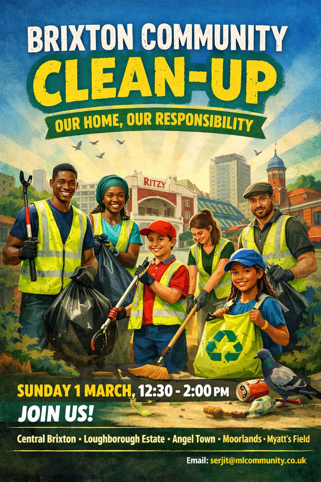 Sunday 1 March, 12:30–2:00pm. Brixton Community Clean-Up. Central Brixton, Loughborough Estate, Angel Town, Moorlands Estate, and Myatt’s Field Park.